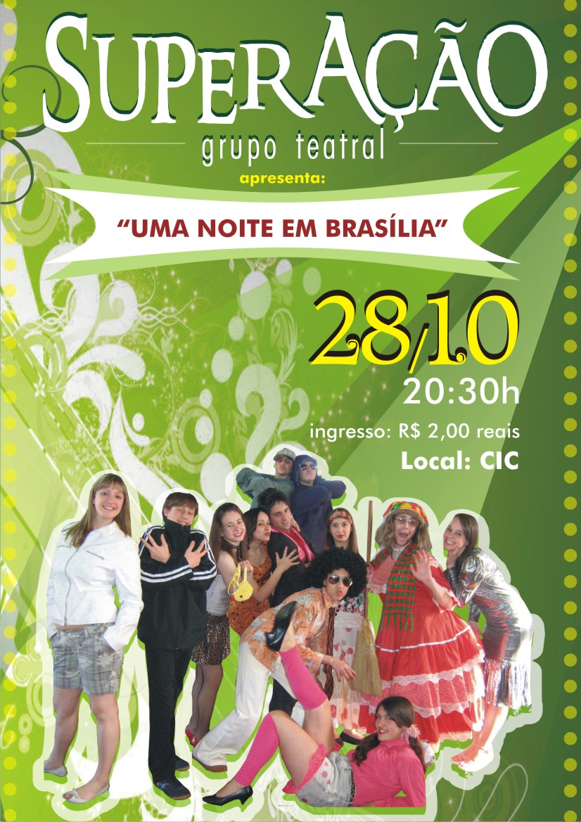 Aconteceu no dia 01/11/2008 o Espetáculo Teatral "Uma Noite em Brasília" do Grupo Teatral SuperAção. Aproximadamente 100 pessoas apreciaram a peça numa noite chuvosa. Embora a chuva tivesse atrapalhado o espetáculo os artistas não perderam o brilho. O publico que assistiu o evento se divertiu com os personagens que arrancaram boas gargalhadas da platéia. O grupo teatral SuperAção agradece a todos que deixaram suas casas e vieram apreciar nosso espetáculo a todos o nosso respeito e admiração.